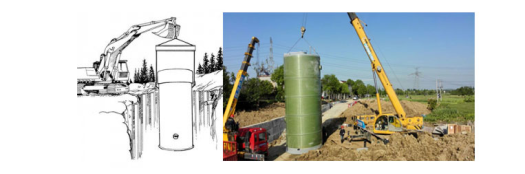 用升降套索把泵站井筒从水平位置起吊到垂直位置。在这个工作阶段,为了安全起见以及对 预制 泵站筒体的保护,壳体上的吊钩是不允许使用 的。(如图下图)